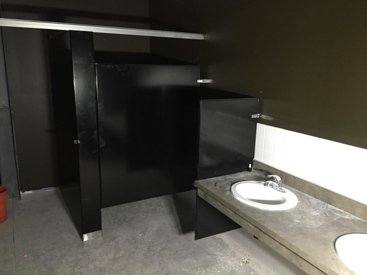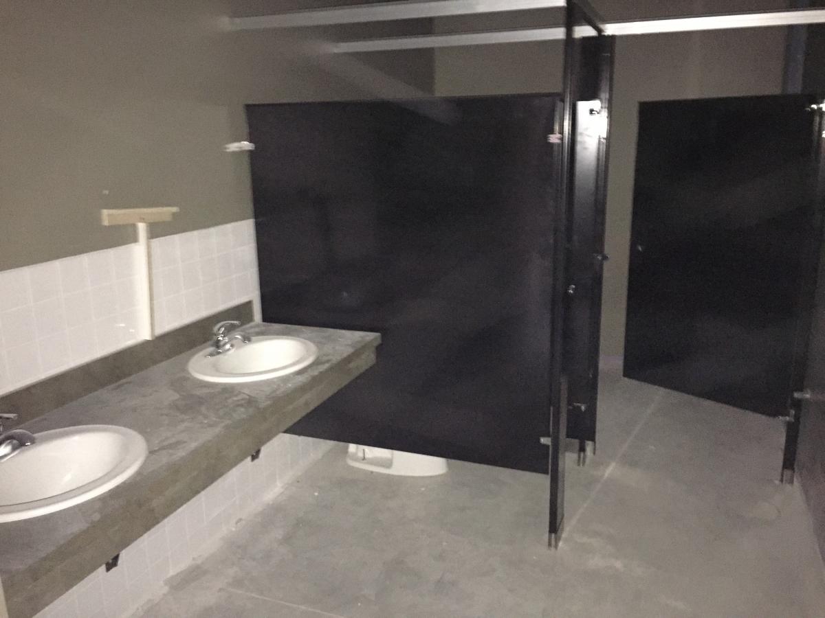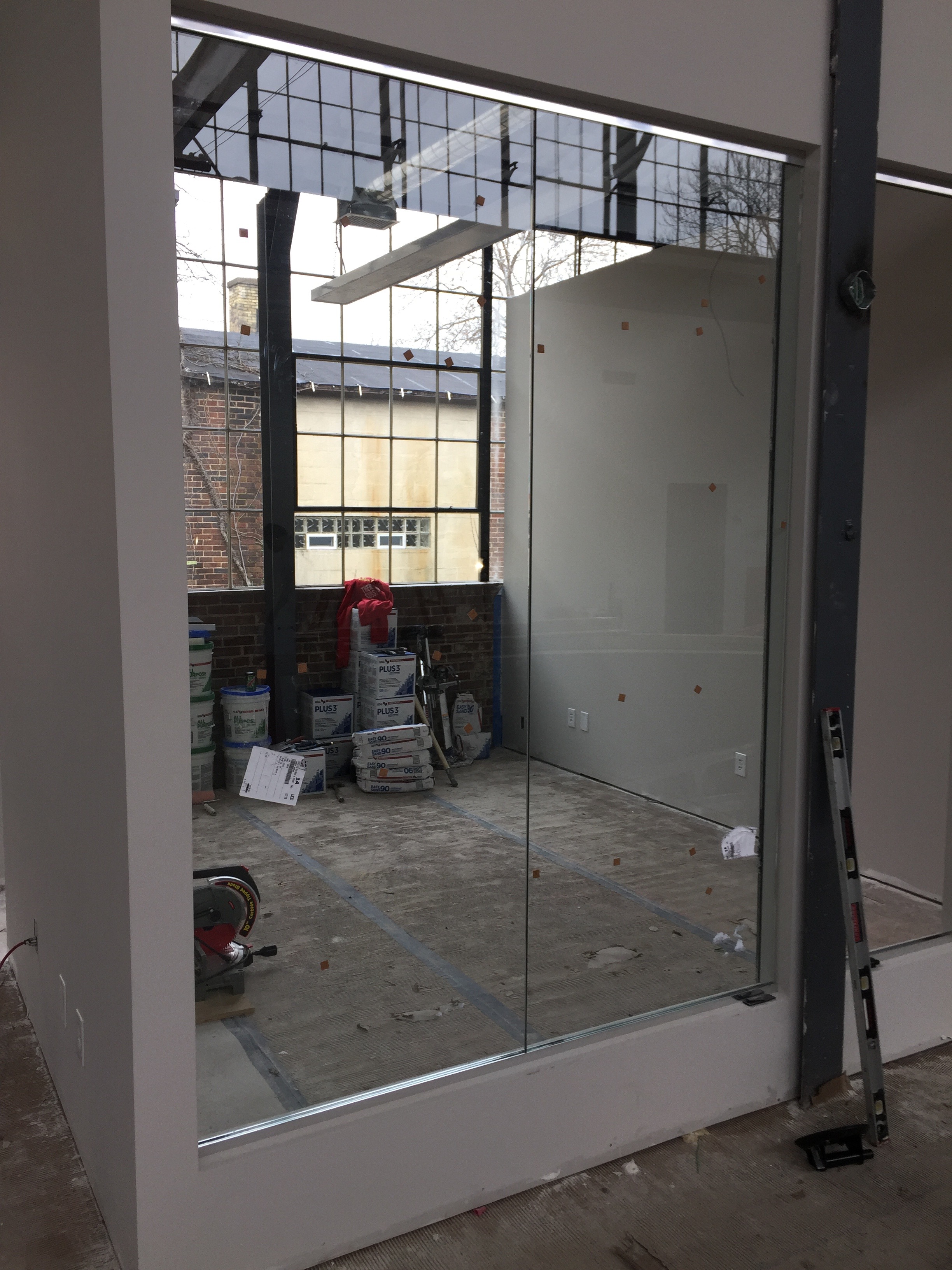 Glass goes in on interior offices as partitions and fixtures are installed in the women's...